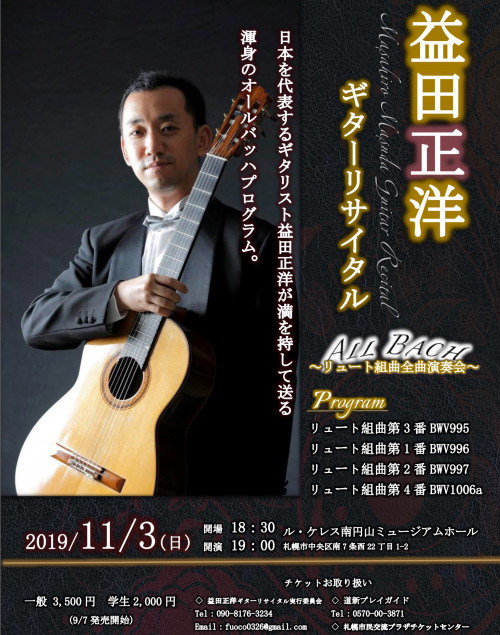 お問い合わせ益田正洋リサイタル実行委員会 090-8176-3234、fuoco0326@gmail.com、道新プレイガイド 0570-00-3871、札幌市民交流プラザチケットセンター