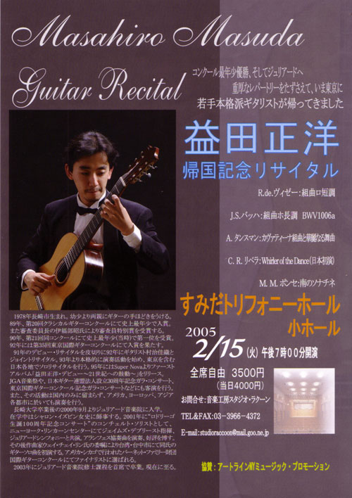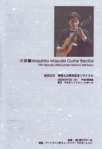 > schedule 益田正洋 帰国&CD発売記念リサイタル 2005/02/15■現代ギター2005年4月号にグラビアが掲載されました曲目:第2幻想曲 Op.4/F.ソル、リュート組曲第4番/J.S.バッハ、カヴァティーナ組曲/A.タンスマン、舞踏のミューズ/C.R.リベラ、南のソナチネ/M.M.ポンセ会場東京/すみだトリフォニーホールチラシ プログラム 益田正洋 帰国&CD発売記念リサイタル